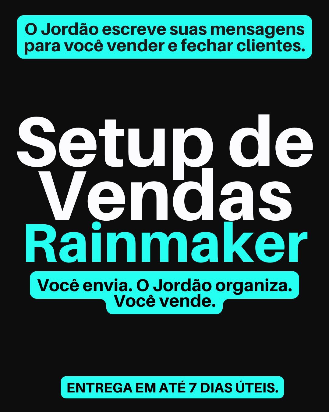 No Setup de Vendas Rainmaker, o Jordão define o seu funil e escreve as mensagens de abordagem, reunião, follow-up, negociação e fechamento que o vendedor realmente usa no dia a dia, com entrega em até 7 dias úteis.