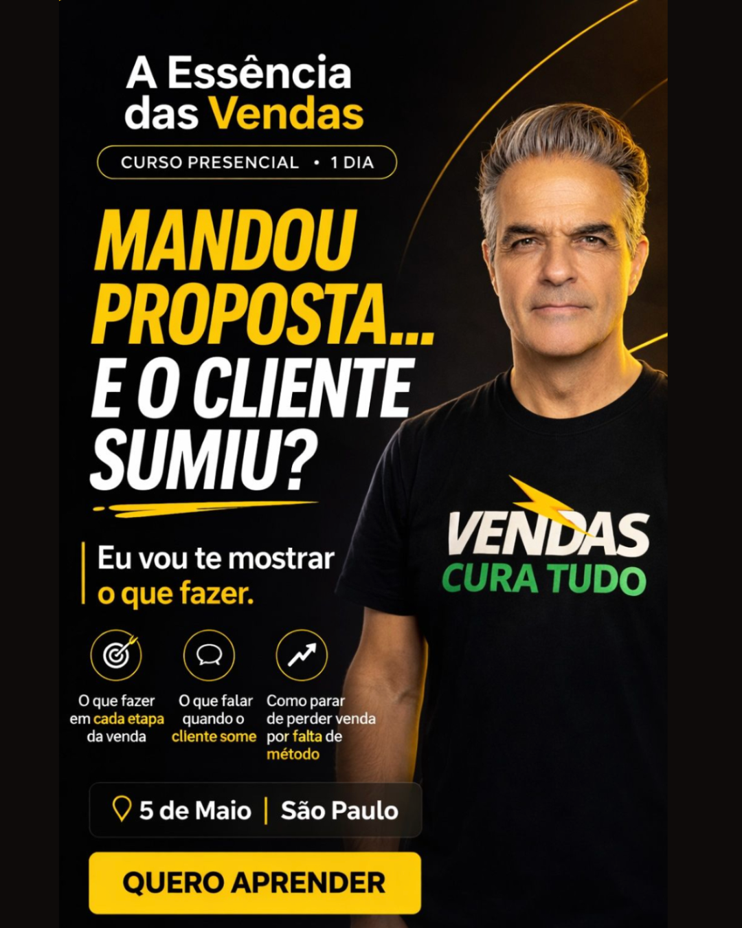 A Essência da Venda é um curso presencial de 1 dia, direto ao ponto, para você aprender o que fazer em cada etapa da venda, o que falar depois que o cliente some e como parar de perder venda por falta de método. Vamo ai?